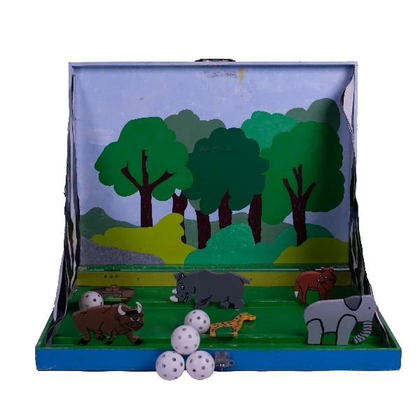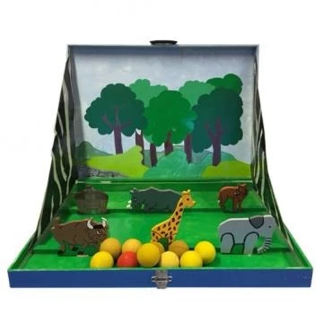 In de spelbak staan enkele dieren opgesteld. Probeer deze dieren met de foamballetjes omver te gooien.