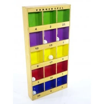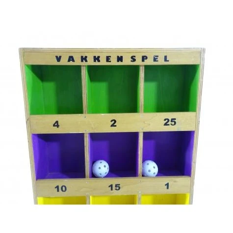 Op de vakken staan de te behalen punten. Probeer de ballen van enige afstand in de vakken te gooien. Speler met de hoogste score wint. Wie scoort er het hoogst?