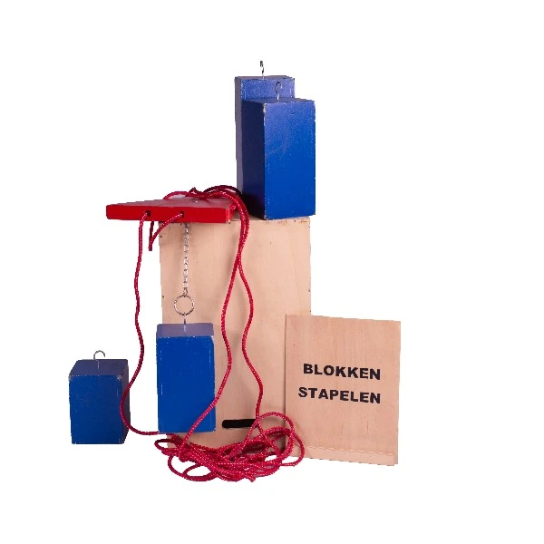 Pakket bestaand uit: 3 blokken met haken, een driehoek met 3 touwtjes en een ring waar de haken in moeten
