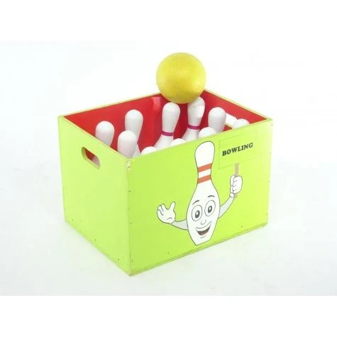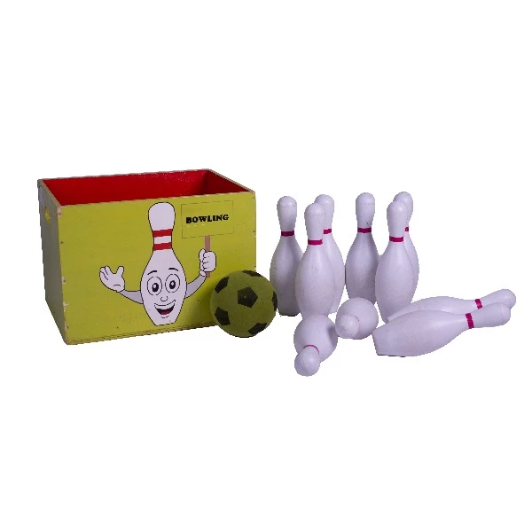 Pakket bestaand uit: Een krat met daarin 10 bowlingkegels en een bal van zacht materiaal (kunststof)