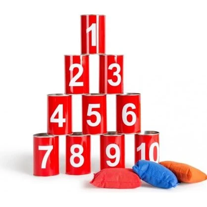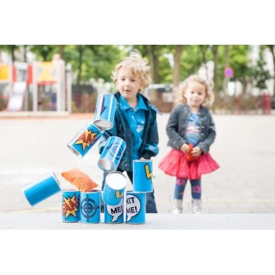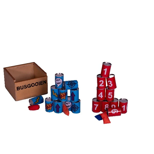 Gooi met pittenzakjes van enige afstand zoveel mogelijk van de bussen omver. Kan jij dit in 3 pogingen allemaal. En je tegenstander kan hij in minder pogingen.