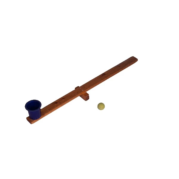 Busje wip bestaat uit een houten wipplank voorzien van een kunststof bus. Doe de bijgeleverde tennisbal in de bus. Duw de plank aan de andere zijde naar beneden.