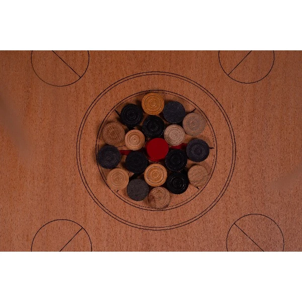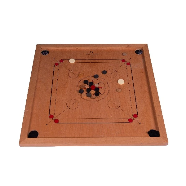 Bedoeling is dat de speler zijn negen carromstenen in de gaten krijgt vóór dat de tegenspeler dat doet. Let op! Er zitten wel veel regels aan vast.
