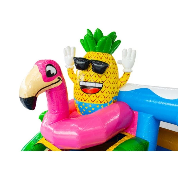 Glij samen met de mega grote ananas van de glijbaan! Op het Slide Combo Doubleslide Hawaii Flamingo springkussen zijn alle mogelijkheden voor urenlang speelplezier. Klim erin, spring erop los en roetsj van de glijbaan zo het badje in! De keuze is reuze, want er zijn zelfs twee glijbanen op dit te gekke springkussen. De doubleslide Hawaii is ook te huren zonder zwembad. Klik hier voor de springkussen zonder zwembad