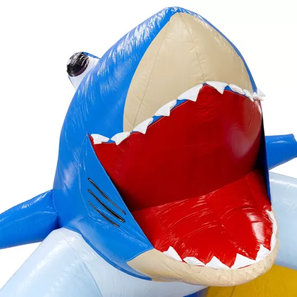 Met de grote 3D-haai bovenop is dit springkussen een echte blikvanger die meteen de aandacht trekt op ieder feest of evenement.