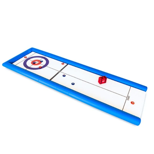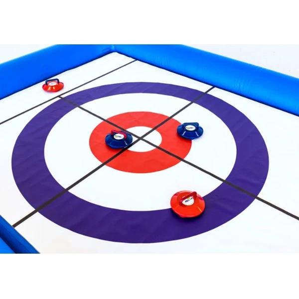 Pakket bestaand uit: Curling spel Inflatable, handblower en verankering, 3 gele curlingstenen en 3 rode curlingstenen.(afwijkend dan foto)