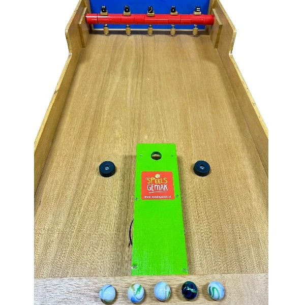 In dit pakket zit: 1 spelbak, 5 ballen, 5 dobbelstenen.