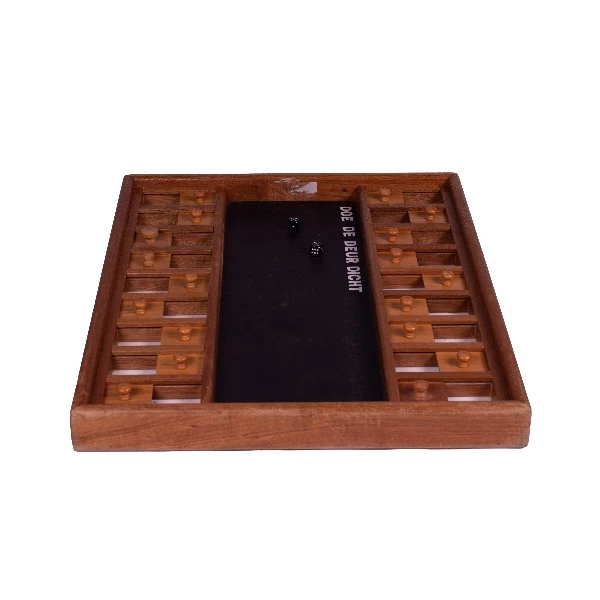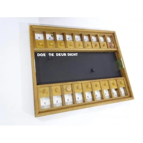 Pakket bestaand uit: Een houten spelbak met genummerde vakjes met daarvoor houten schuifjes