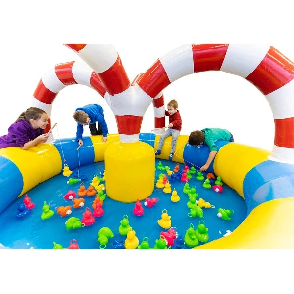 Pakket bestaand uit: Luchtkussen, 150 eendjes, 4 hengels, blower, grondpennen/gewichten en op- en afbouw instructies