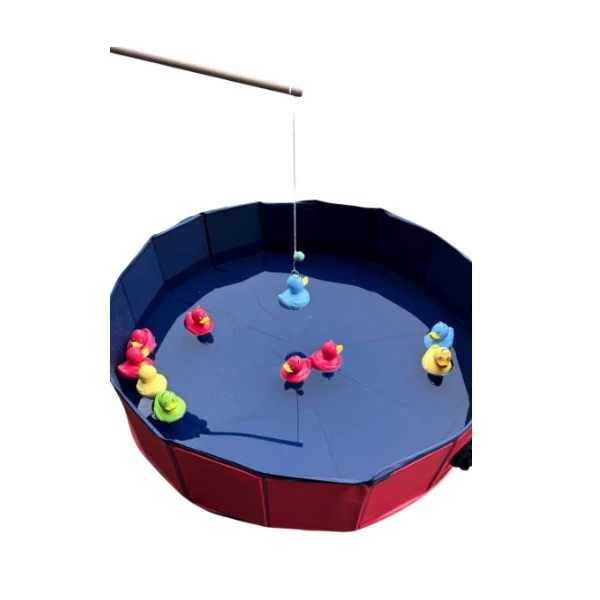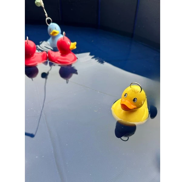 Vul de vijver met water en leg de eendjes er in. Laat de kinderen met de hengeltjes eendjes vangen.