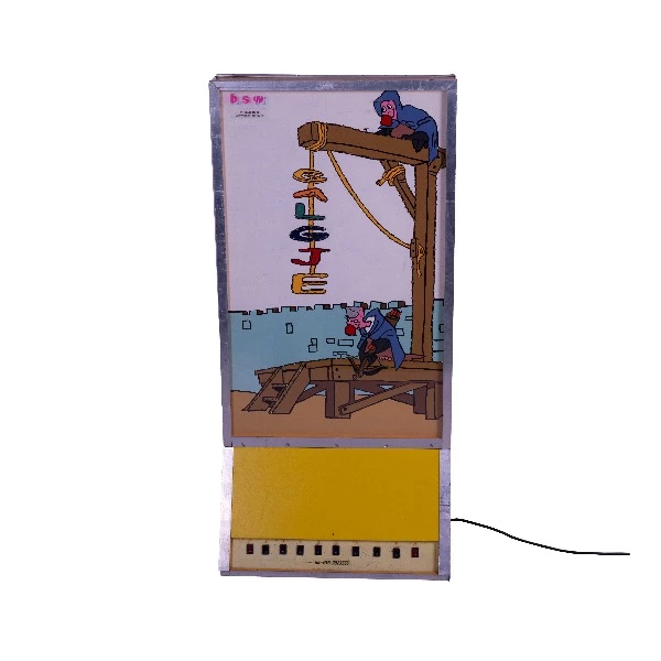 Het spel is elektrisch, het spel heeft op de achterkant een vak met vele letters van het alfabet. Als u het spel wilt spelen en tijdens het spel raadt u de letters fout dan weet u wanneer u het spel heeft verloren als het laatste lampje gaat piepen. (het laatste lampje is de onderste letter E).