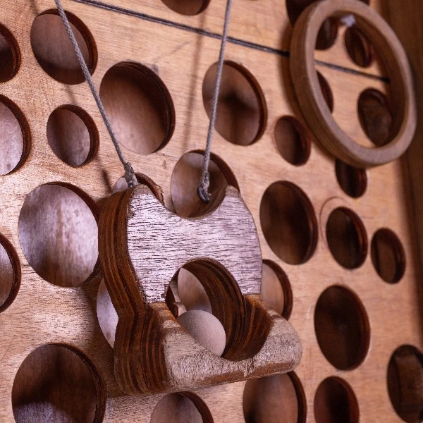 Met hulp van de van 2 touwtjes met handvaten moet je proberen het balletje in de houder naar het bovenste gat te krijgen. Je moet alle andere gaten zoveel mogelijk proberen te ontwijken.