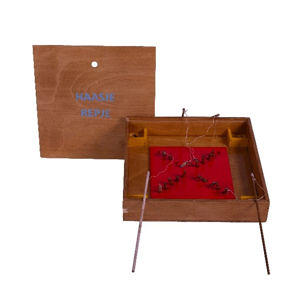 Pakket bestaand uit: Een houten spelbord met 20 pionnen en 4 hengeltjes