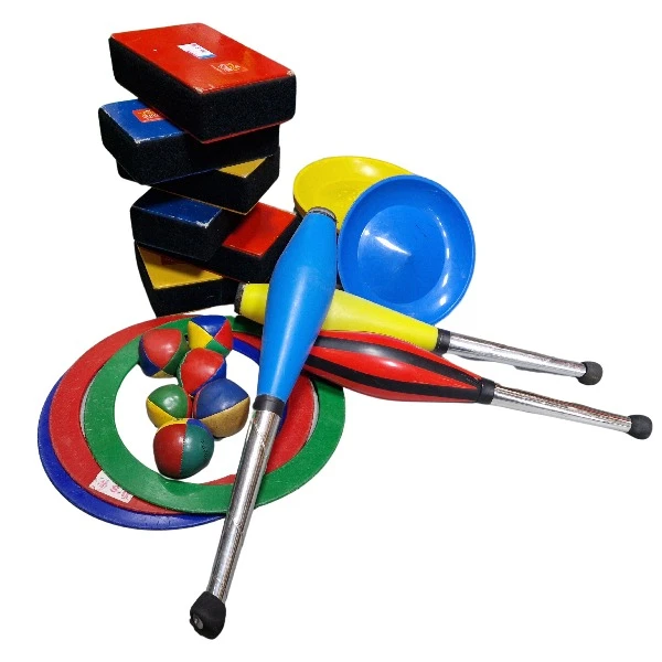 Deze set mag natuurlijk niet ontbreken in een goede circusact. Jongleerset bestaat uit blokken, bordjes met stokken, kegels, ballen en ringen.