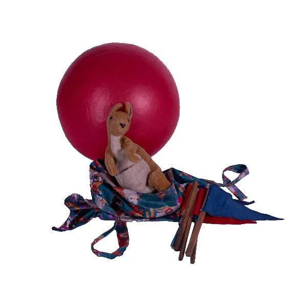 Doe de buidel om je middel en spring op de skippybal om de vlaggen naar het nest. Haal de baby er uit en stop die in de buidel. Spring terug naar startplaats.