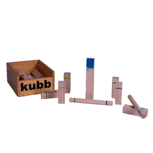 Bij dit spel is het de bedoeling om de houten blokken omver te kegelen door de houten stokken tegenaan te gooien.