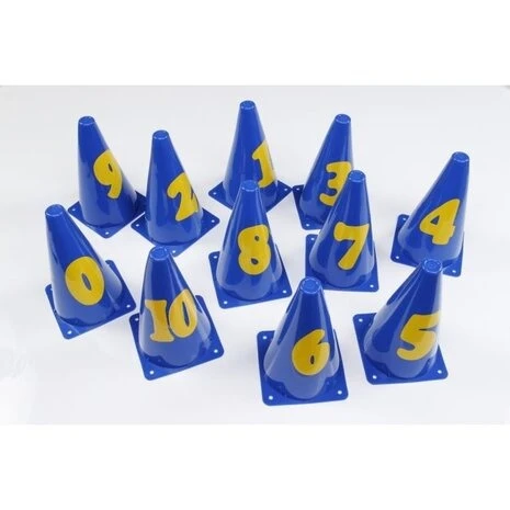 De set van 11 plastic pionnen met cijfers van 0-10 kan worden gebruikt voor oefen- en educatieve spellen. De pionnen zijn voor binnen en buiten te gebruiken. De kinderen leren omgaan met cijfers. Zo kunnen stationnen of eilanden worden gelabeld met individuele nummers, bepaalde nummerreeksen verlopen of worden kleine computertaken uitgevoerd.