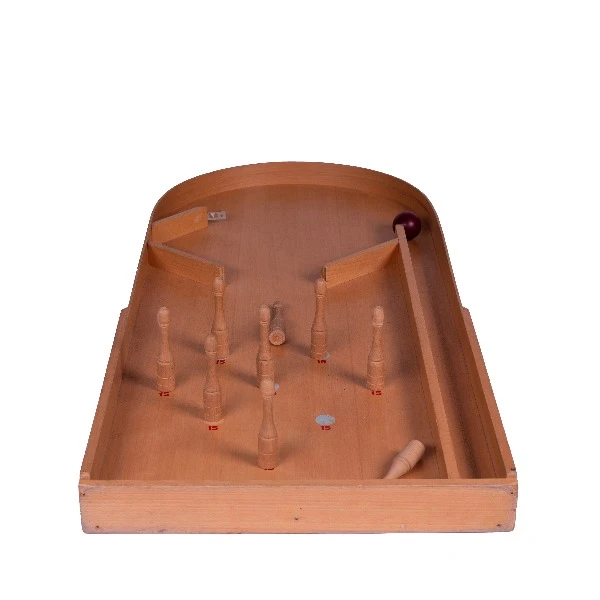 Pakket bestaand uit: Een houten spelbak met 9 houten kegels en een bal