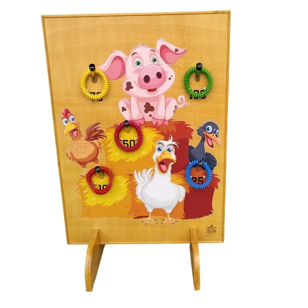 Probeer met de ringen zoveel mogelijk punten te scoren door de ringen te gooien tegen het bord zodat ze blijven hangen.
