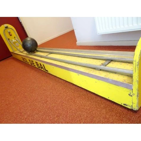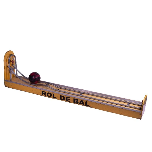 Pakket bestaand uit: een lange houten bak met daarop een metalen buisgeleiding en bowlingbal