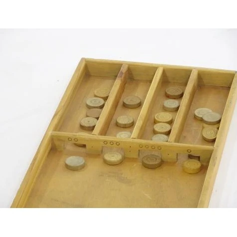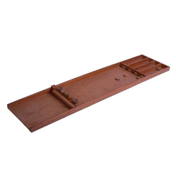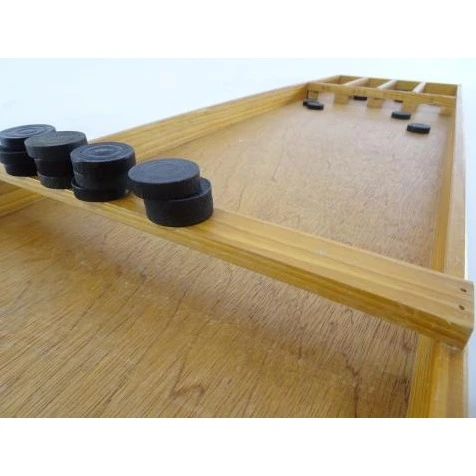 Een houten mini sjoelbak. De sjoelschijven zijn hierbij net zo groot als damstenen.