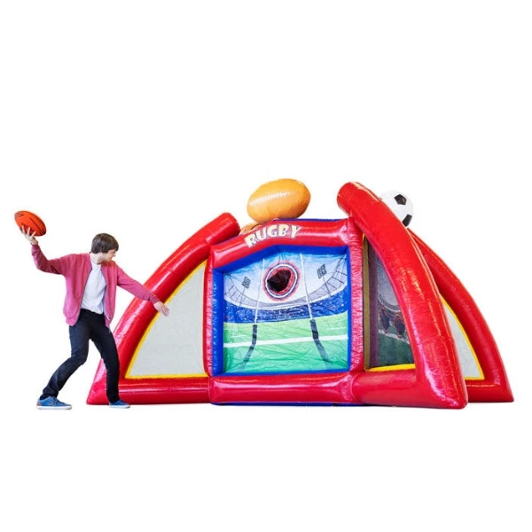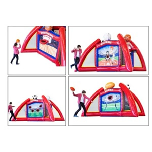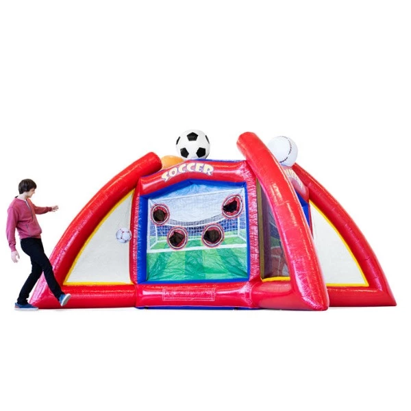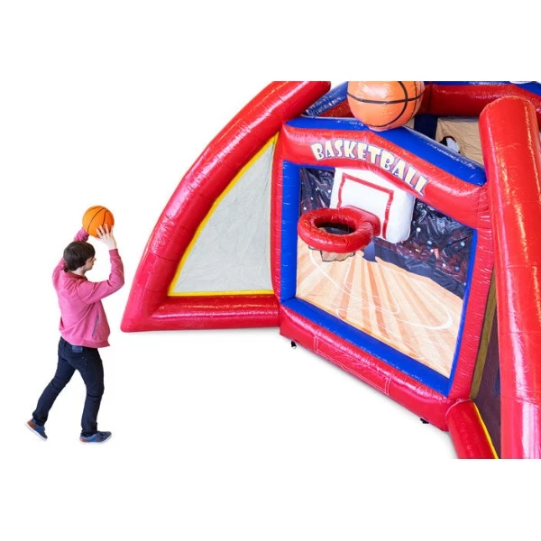 Dit opblaasbare spel is een must voor liefhebbers van balsporten. De inflatable heeft vier wanden waar je een balspel mee kunt spelen. Door de gaten in de wand kun je je voetbal schoppen of baseball of rugbybal gooien. De vierde wand van dit opblaas balspel heeft een basket om een basketbal door te gooien. Een veelzijdig opblaasbaar spel waar je je op verschillende manieren sportief mee kunt vermaken!