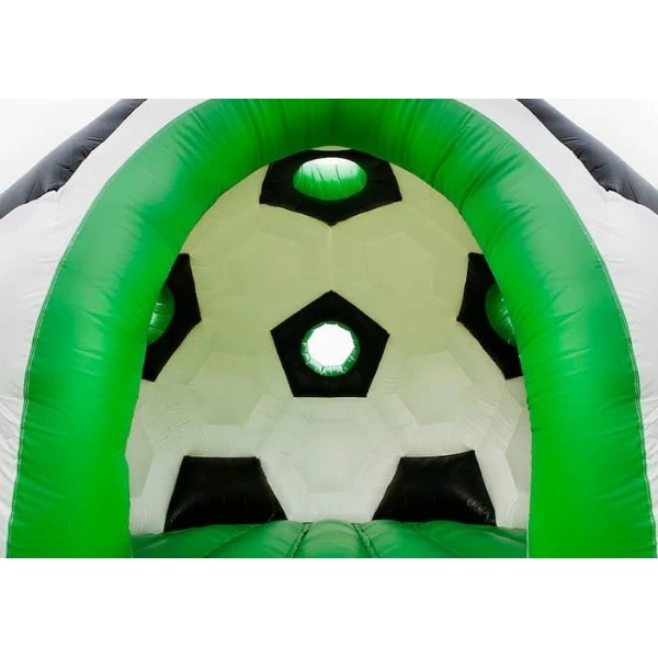 Voetbal is toch het allermooiste wat er bestaat?! Voor veel kinderen is dit springkussen daarom het mooiste kussen wat er is. Binnenin kun je lekker springen en door de raampjes naar buiten kijken om te zien wie er allemaal naar je trucs zitten te kijken.