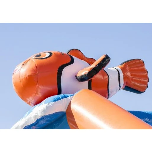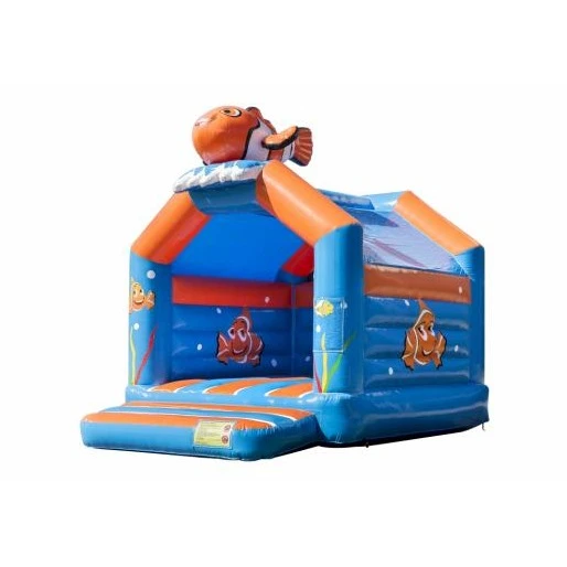 Het Nemo springkussen is een vrolijk springkussen in opvallende kleuren met bovenop een groot 3D clownvis. Het Nemo springkussen heeft mooie animaties op de binnen-, de buitenwanden en op de pilaren.