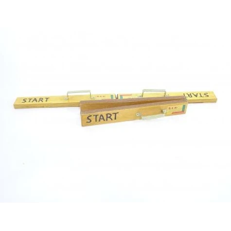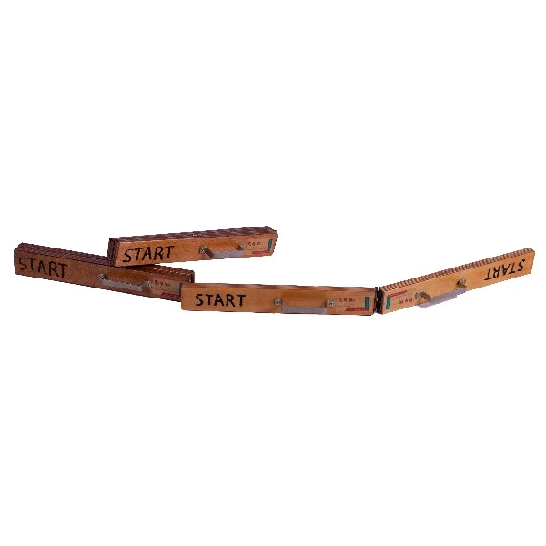 De start- en finishklopper bestaat uit 2 houten delen. Door deze delen tegen elkaar te slaan hoor je een harde klap. Het spel kan beginnen. Kan vervolgens ook worden gebruikt voor aankondiging van het einden van de partij.