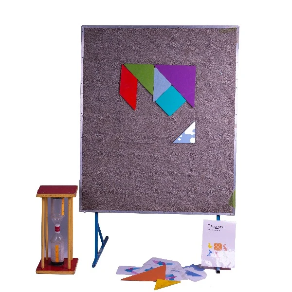 Pakket bestaand uit: Een bord met 7 tangramstukken en een zandloper
