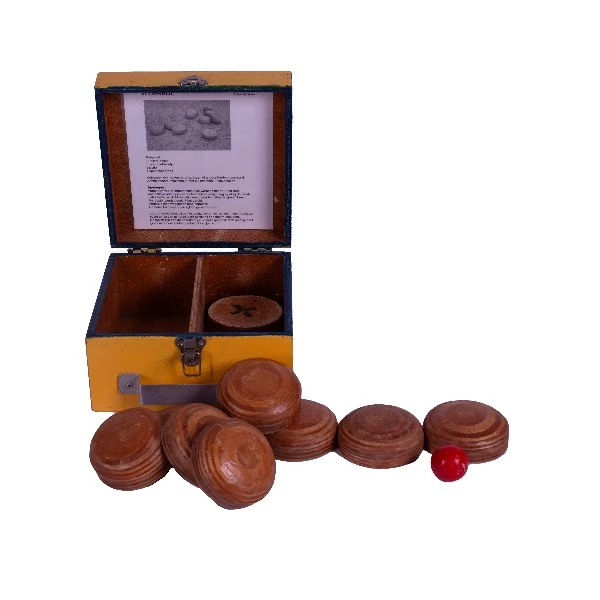 Pakket bestaand uit: 10 halve bollen, 1 rood balletje geleverd in een houten doos.