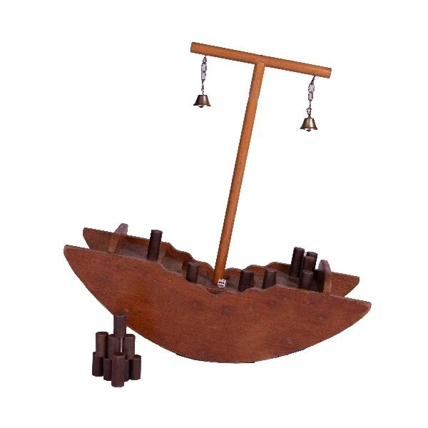 Pakket bestaand uit: Een houten boot met belletjes, 14 gewichtjes en 2 dobbelstenen